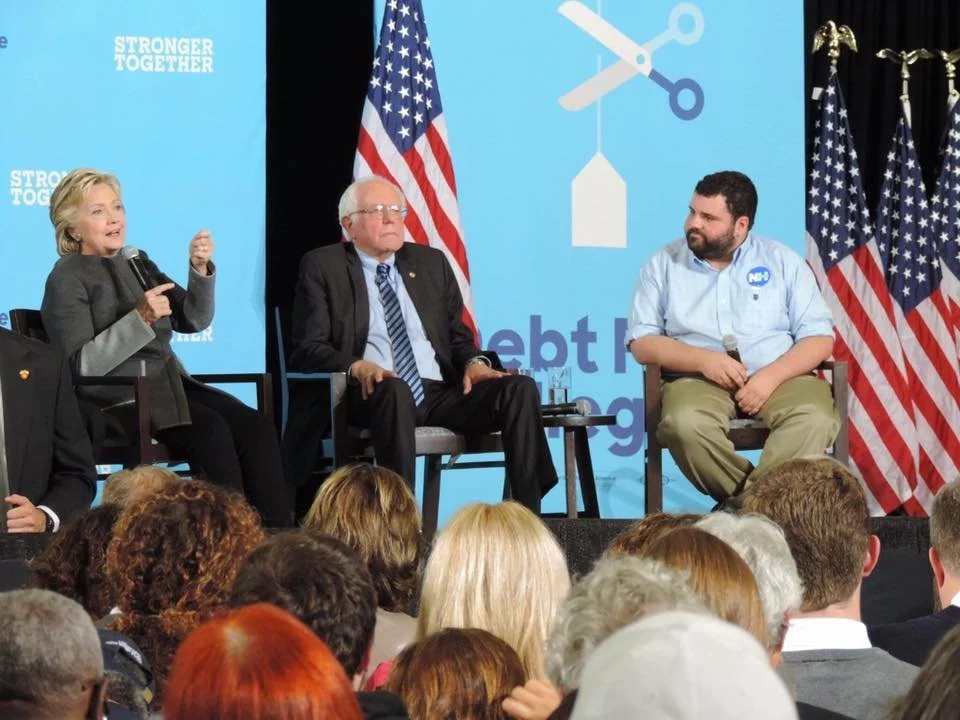 A panel discussion on stage at a political event, featuring Hilary Clinton, Bernie Sanders and Doug Doug Marino